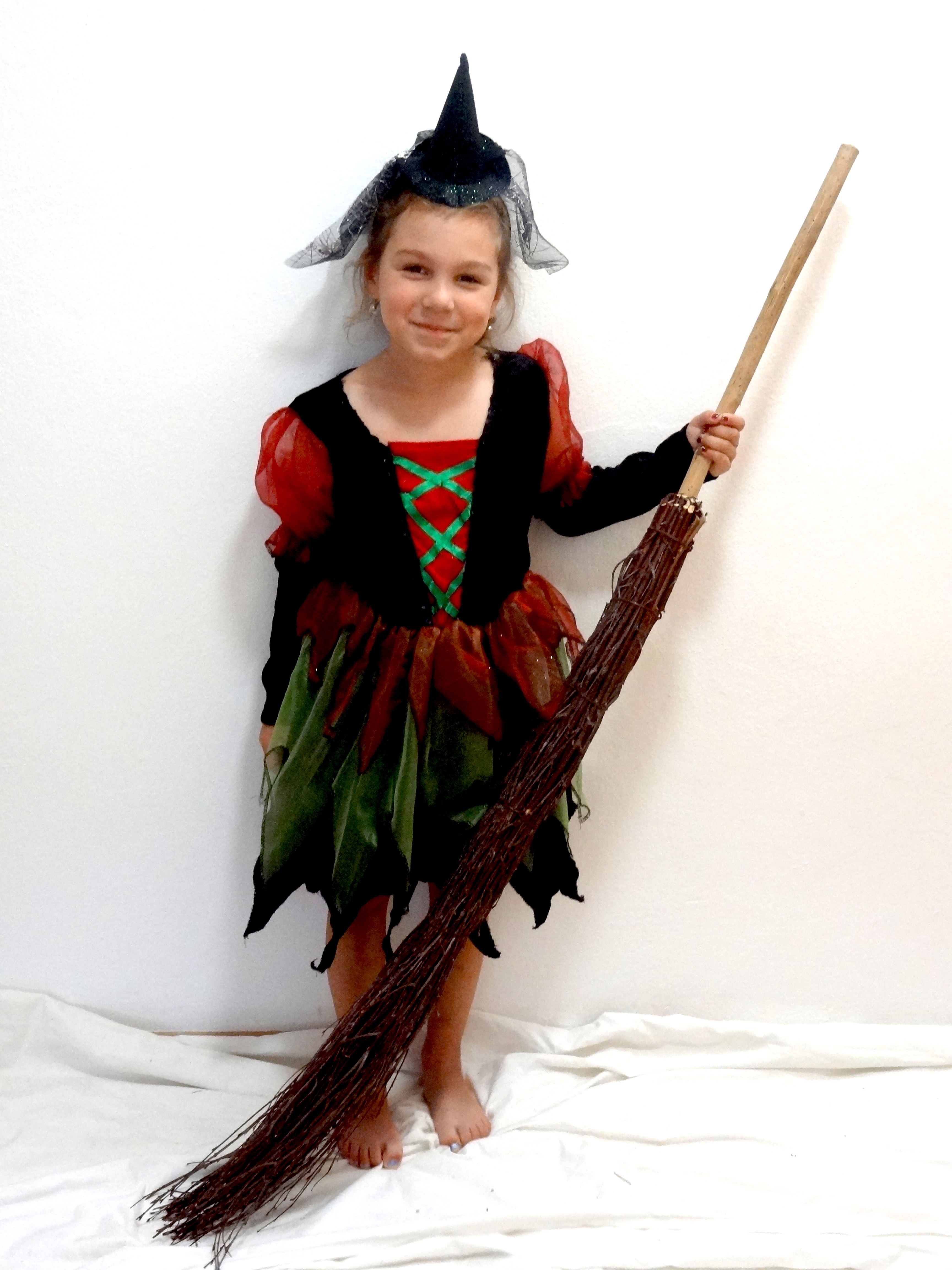 Kostým obsahuje čierne šaty so strapcami a klobúk na čelenke