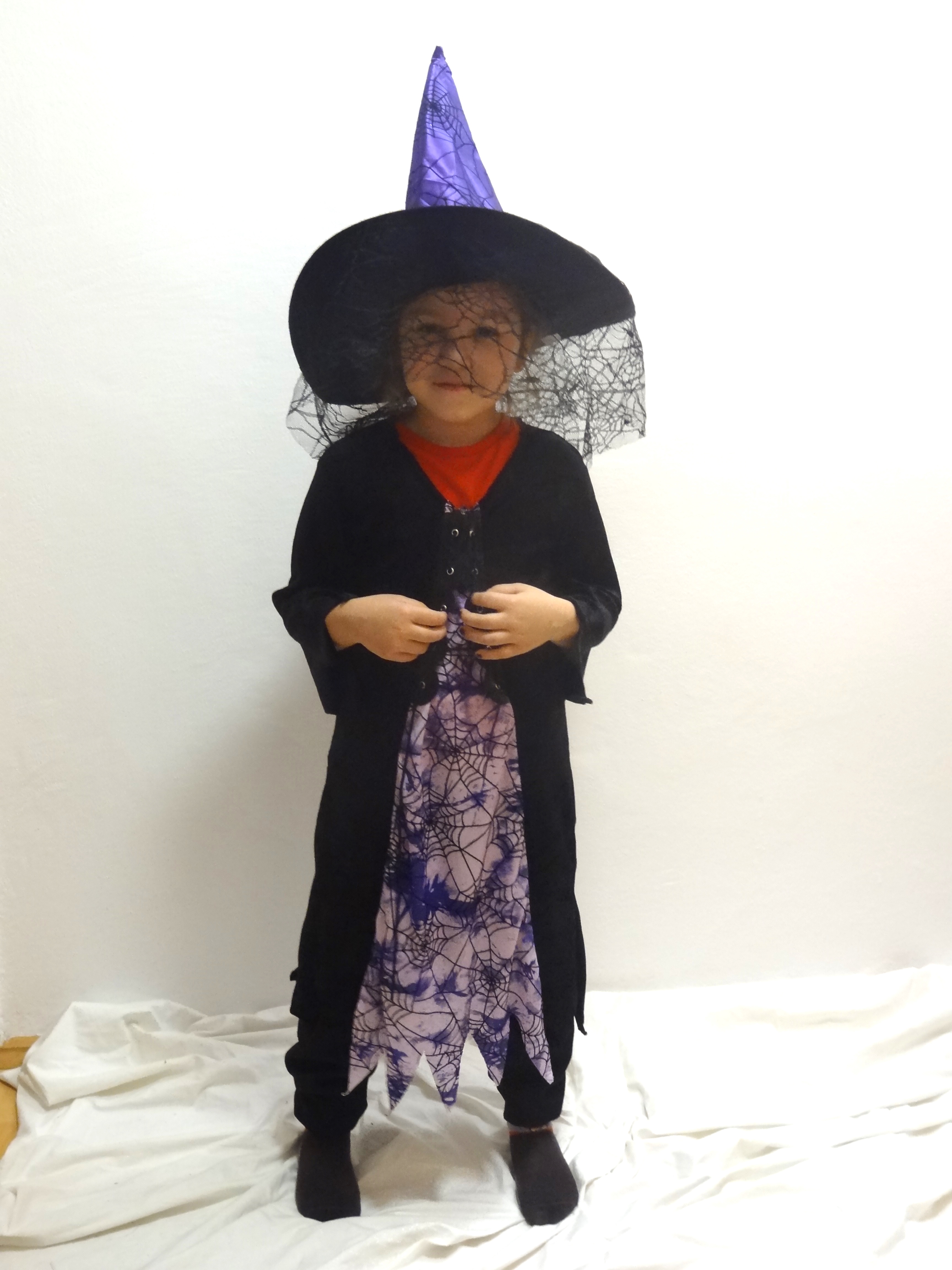 Kostým obsahuje šaty čierne s aplikáciou pavučiny a fialový klobúk so sieťkou