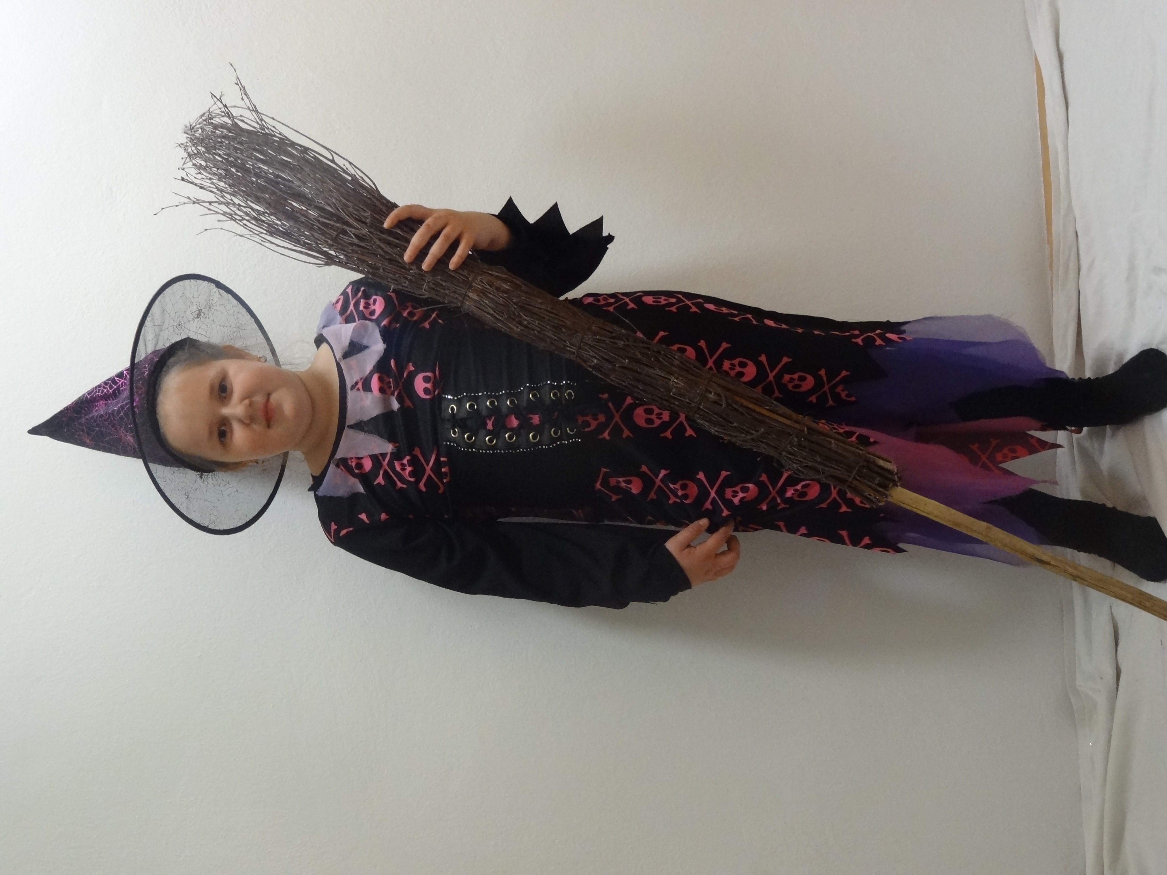 Kostým obsahuje čierno-fialové šaty korzetové a čarodejnícky klobúk
