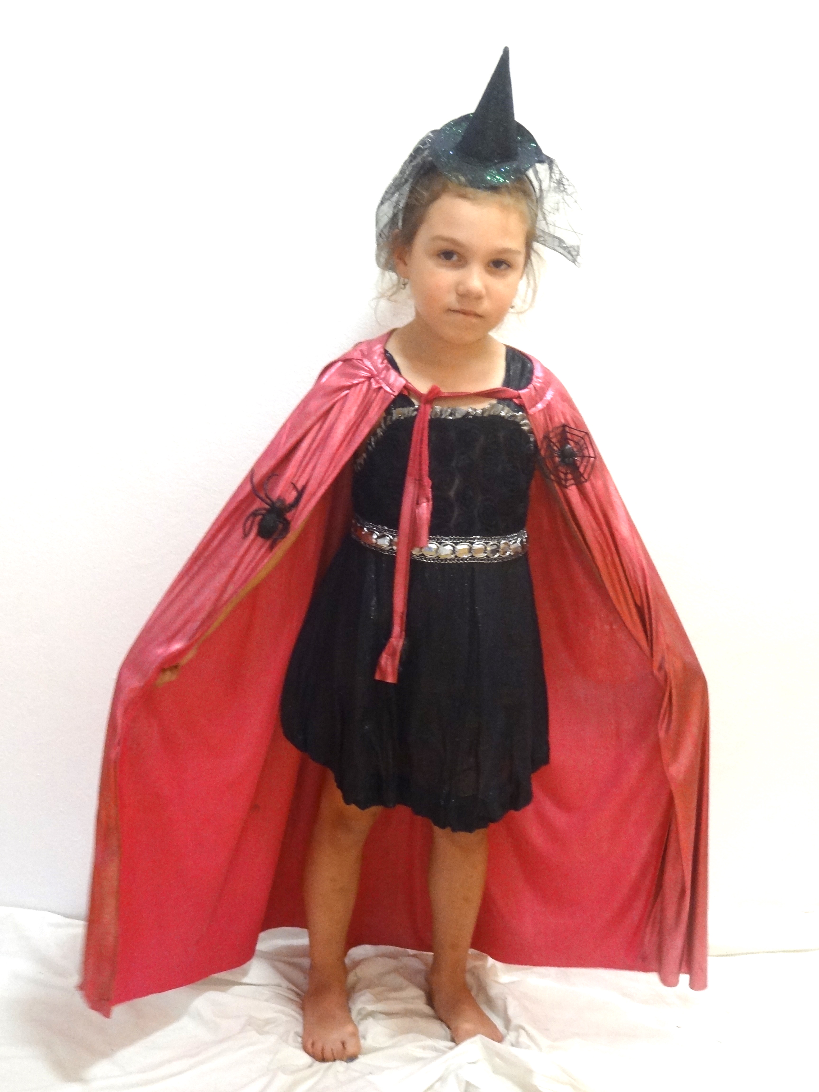 Kostým obsahuje mini šaty čierne, ružový lesklý plášť, klobúk na čelenky, s doplnkami myši a pavúka