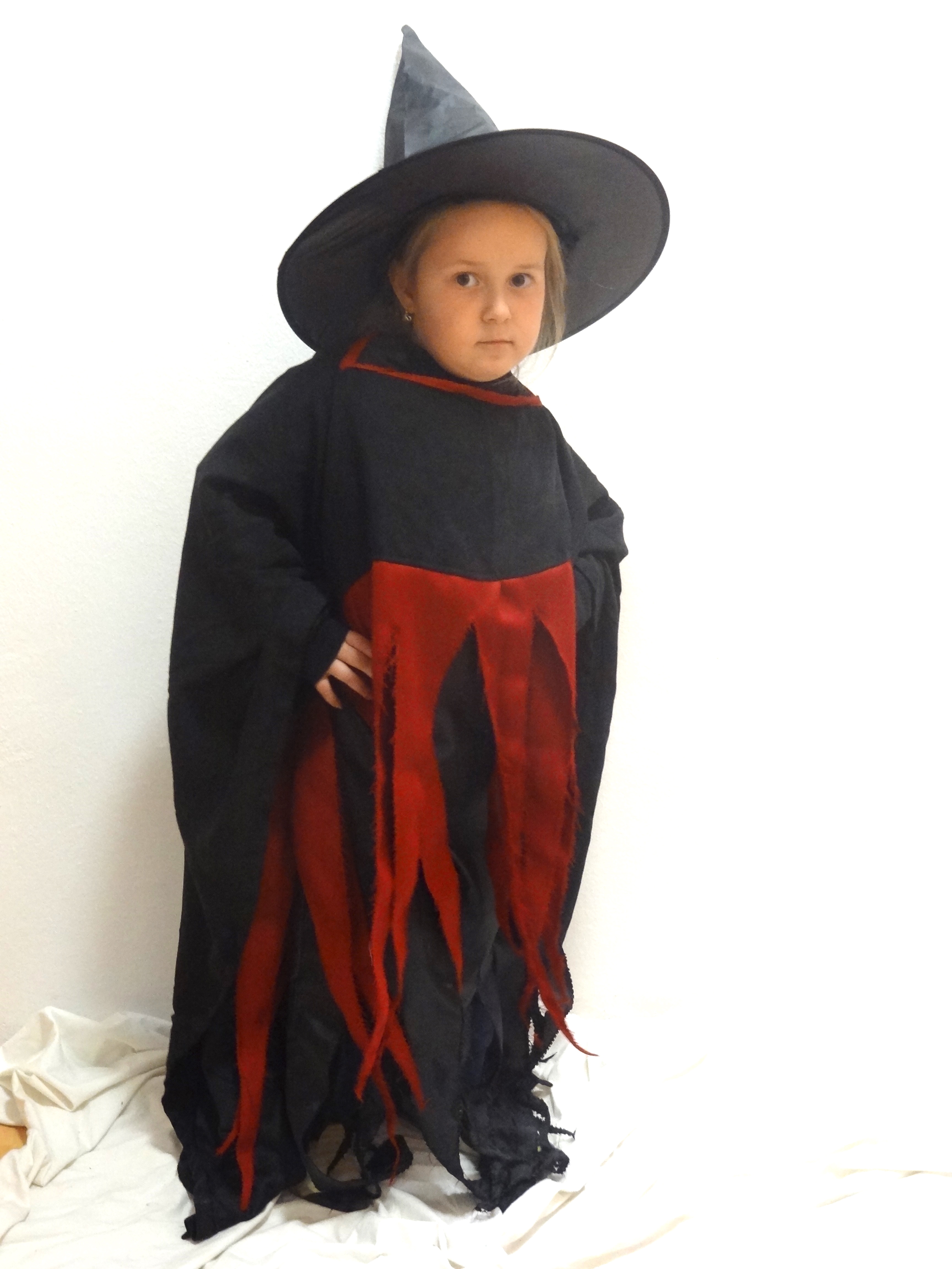 Kostým obsahuje dlhé šaty, plášť čierny s bordovými strapcami a čarodejnícky klobúk