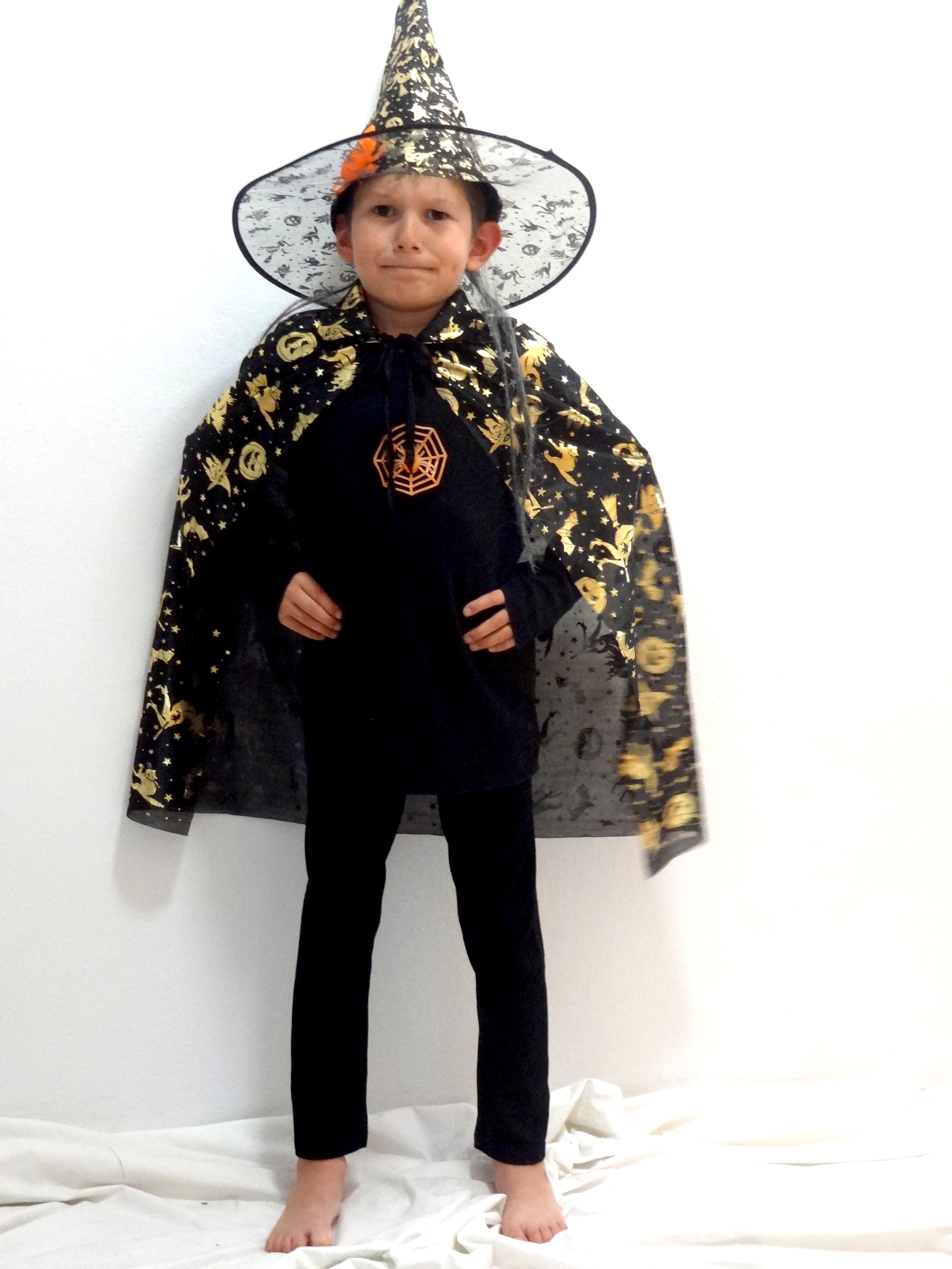 Kostým obsahuje čierny plášť so zlatou potlačou a dekoráciami myš a pavúk a čierny klobúk s potlačou