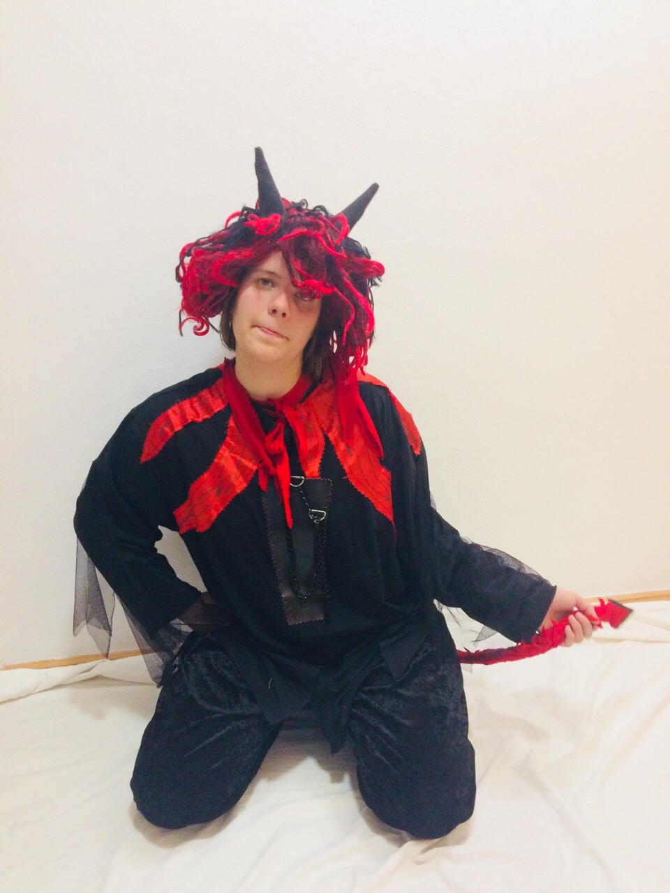 Kostým obsahuje čiernu košeľu s reťazou a červenými aplikáciami, čierne nohavice s chvostom a červeno-čiernu parochňu s rohami