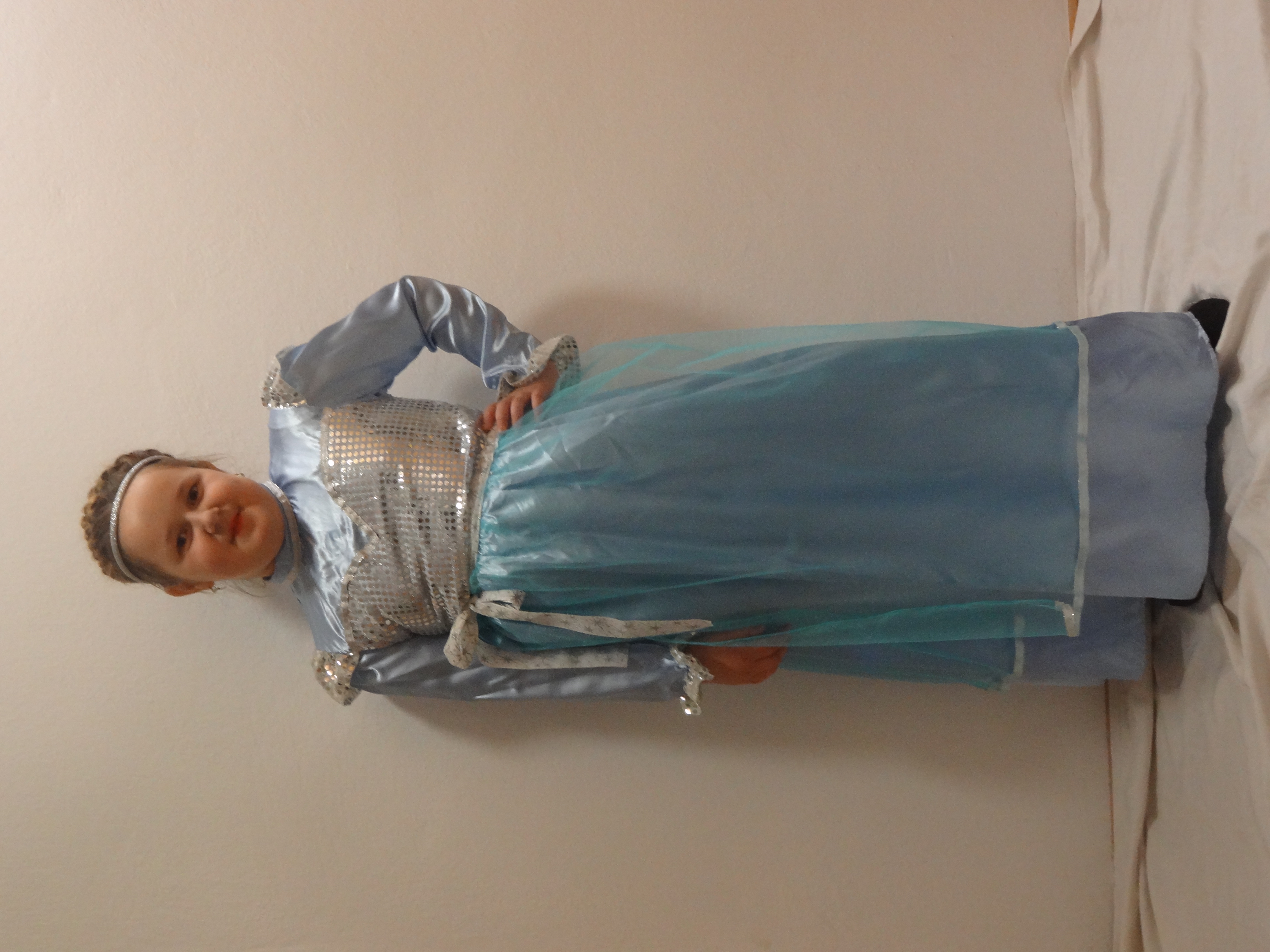 Kostým obsahuje modré šaty so striebornými aplikáciami, modrú tylovú sukňu a čelenku