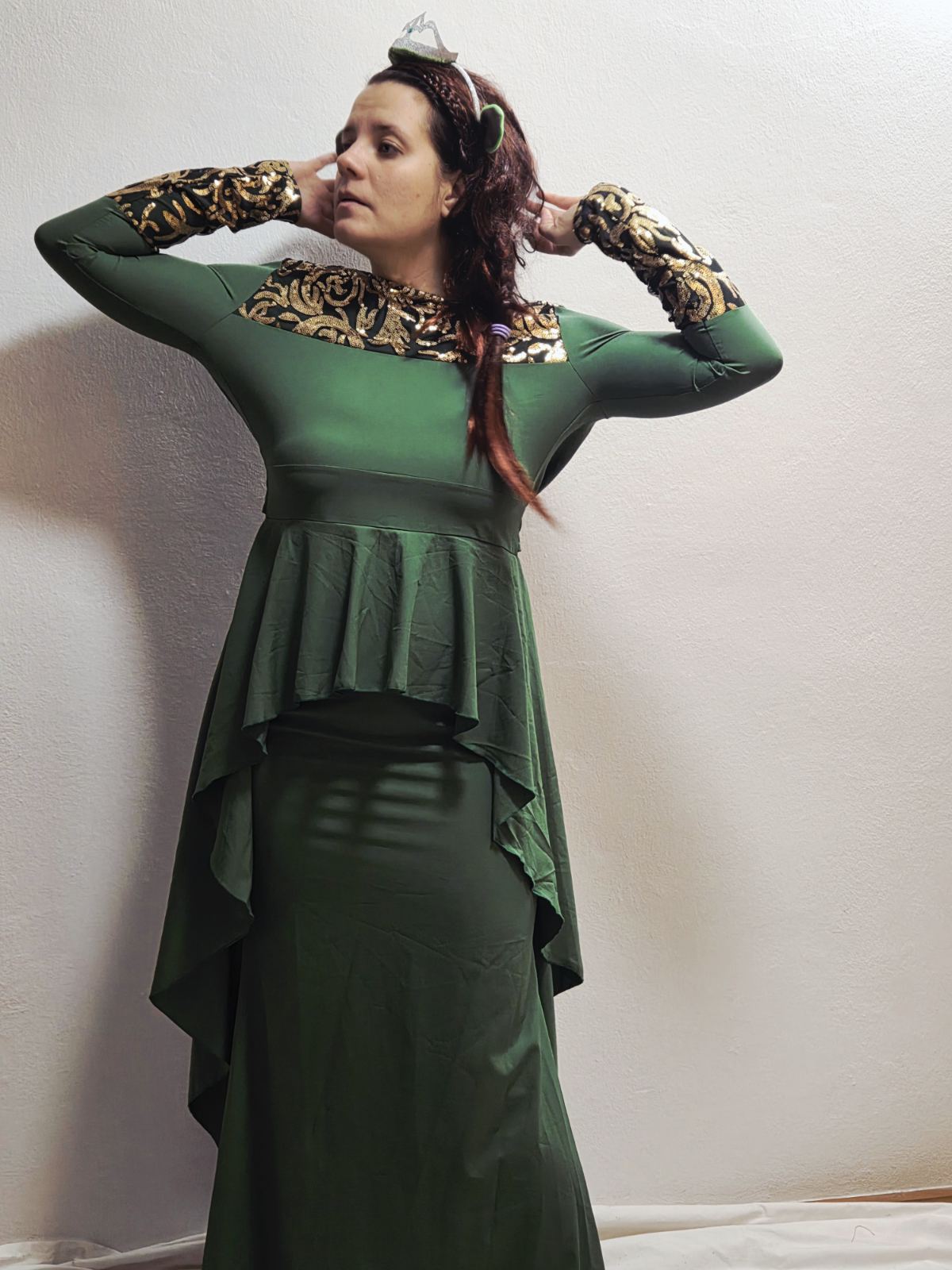 Kostým obsahuje zelené šaty so zlatým efektom, korunku s ušami a parochňu