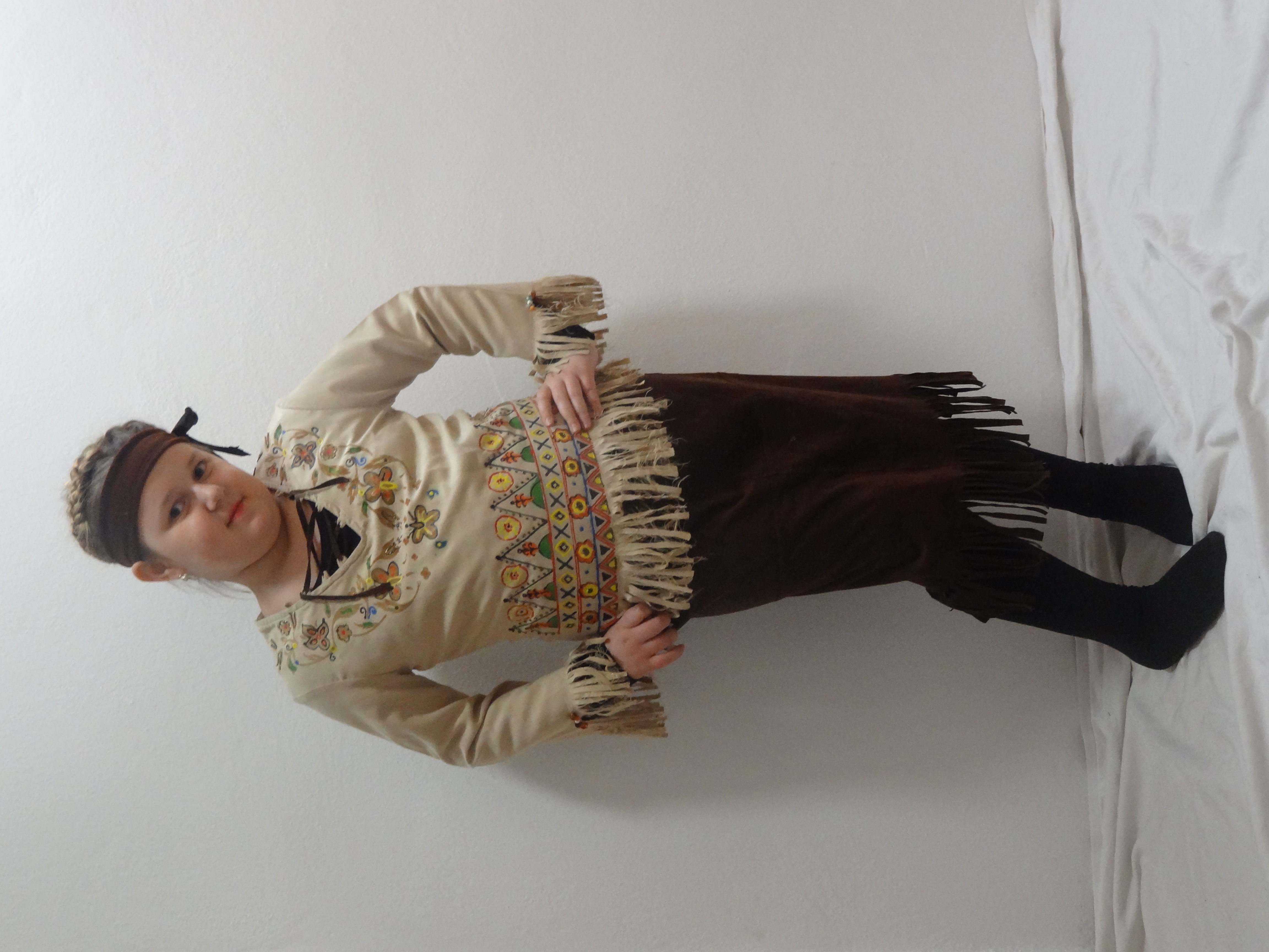 Kostým obsahuje bežovú košeľu s indianskymi motívmi, hnedú sukňu so strapcami a čelenku