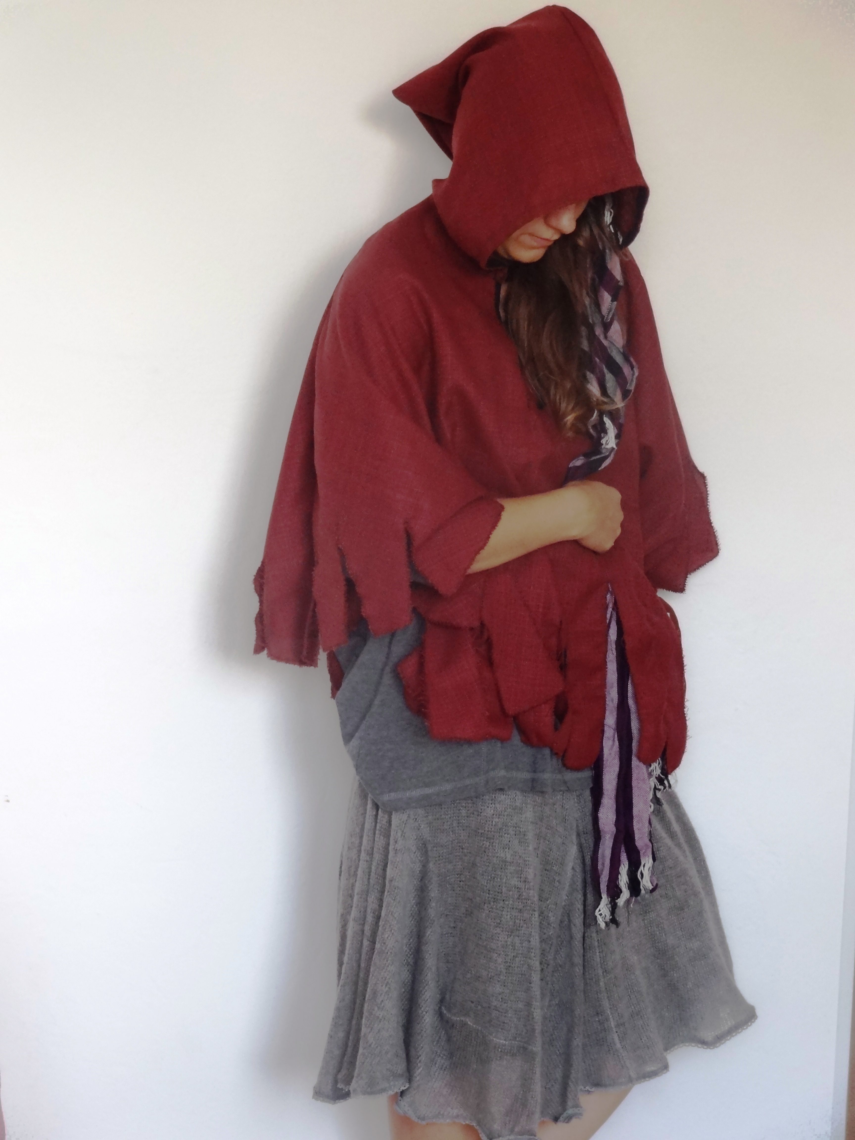 Kostým obsahuje šedú sukňu, dlhé šedé tričko, opasok, šál, károvanú tašku, aplikáciu koláč a bordové pončo s kapucňou