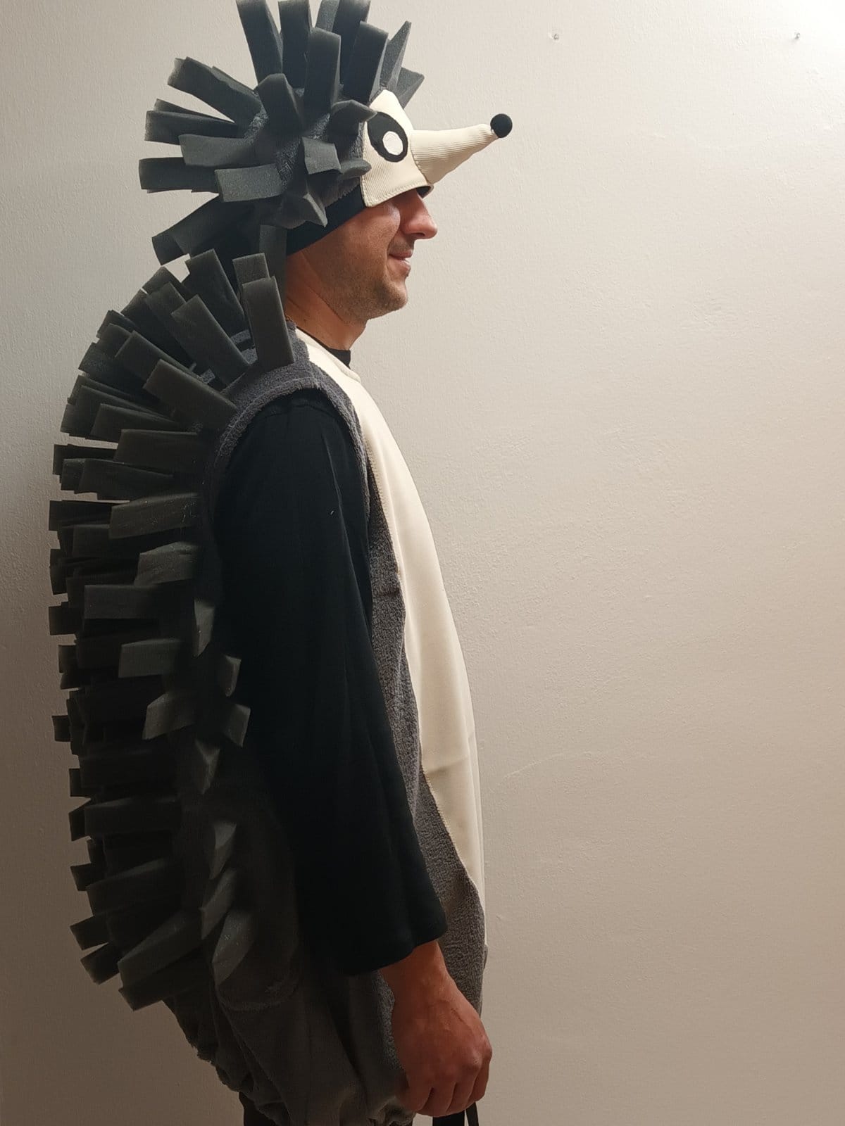 Kostým obsahuje košeľu s pichliačmi, čiapku ježko a čierne tričko