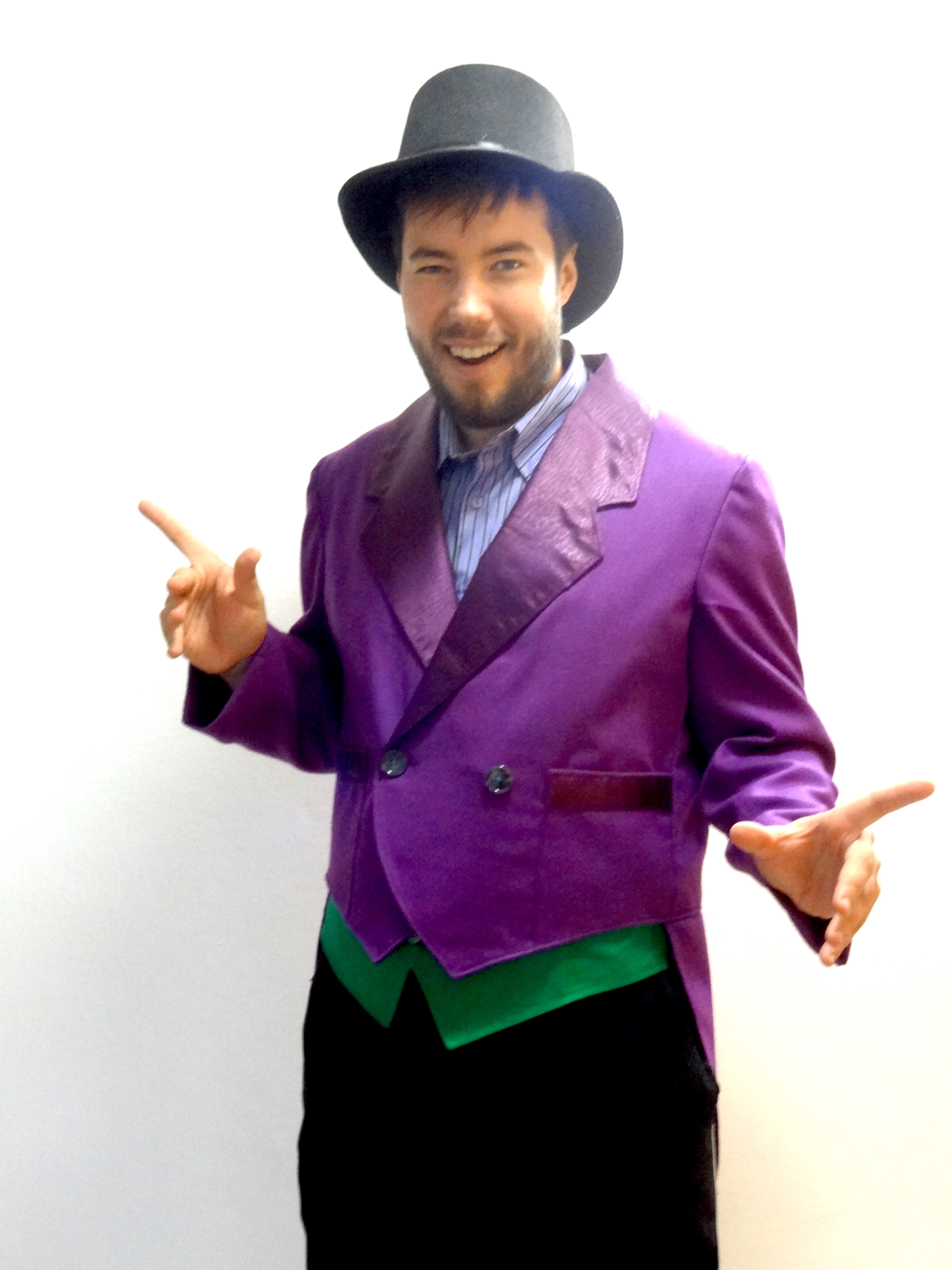 Kostým obsahuje fialovú pásikovú košeľu, zelenú vestu, fialový frak a klobúk
