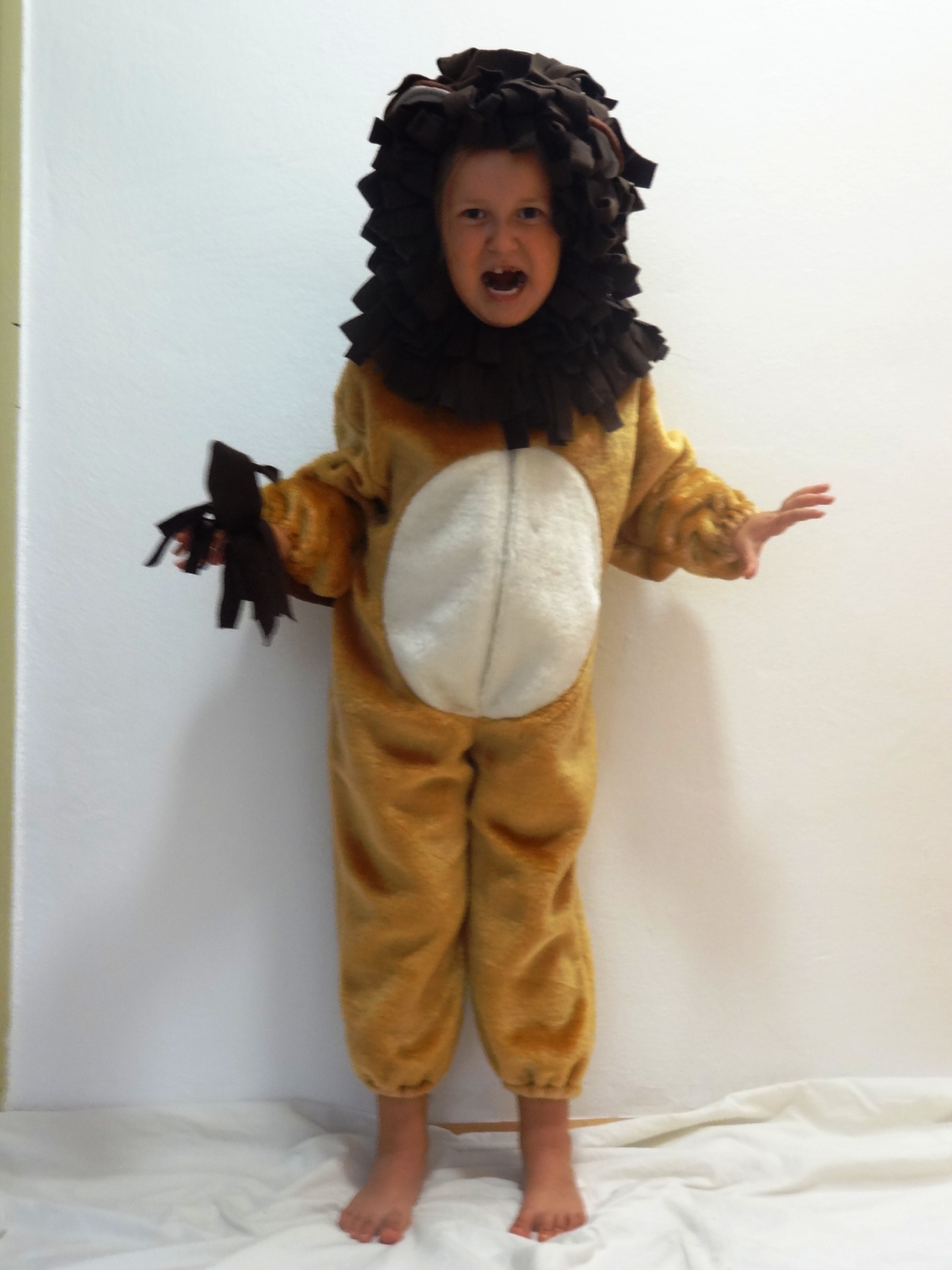 Kostým obsahuje kombinézu s chvostom a čiapku leva