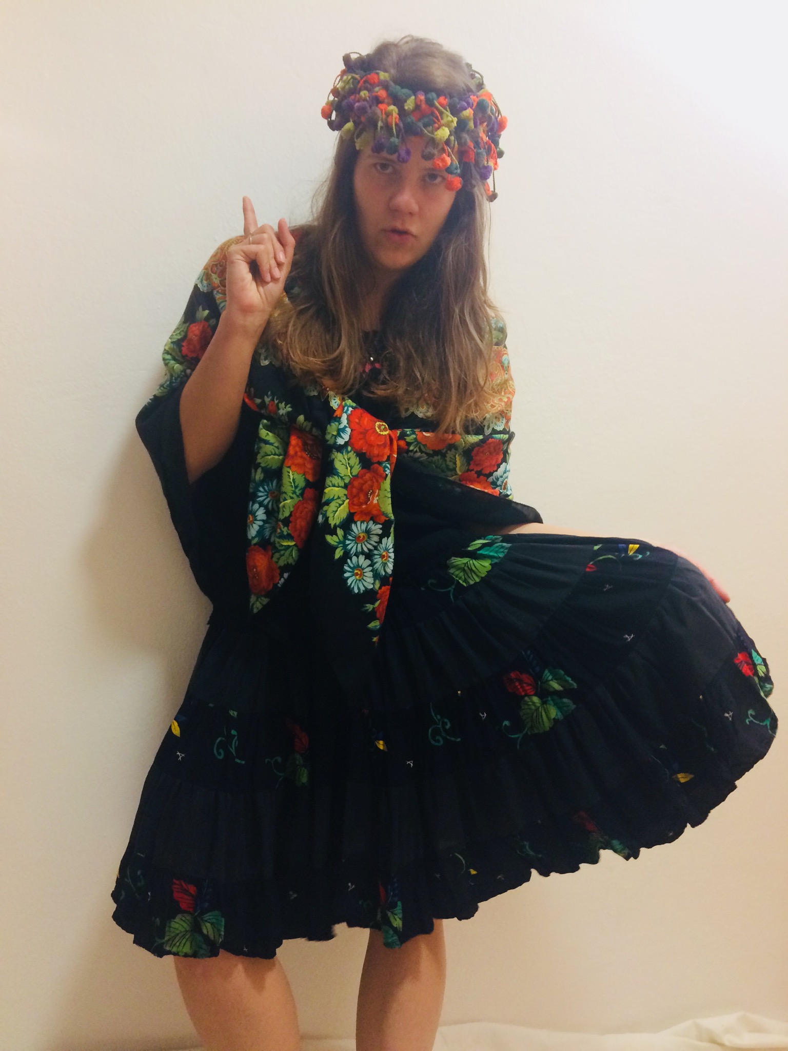 Kostým obsahuje čiernu volánovú sukňu, šatku s kvetmi, tričko a farebnú čelenku s brmbolcami