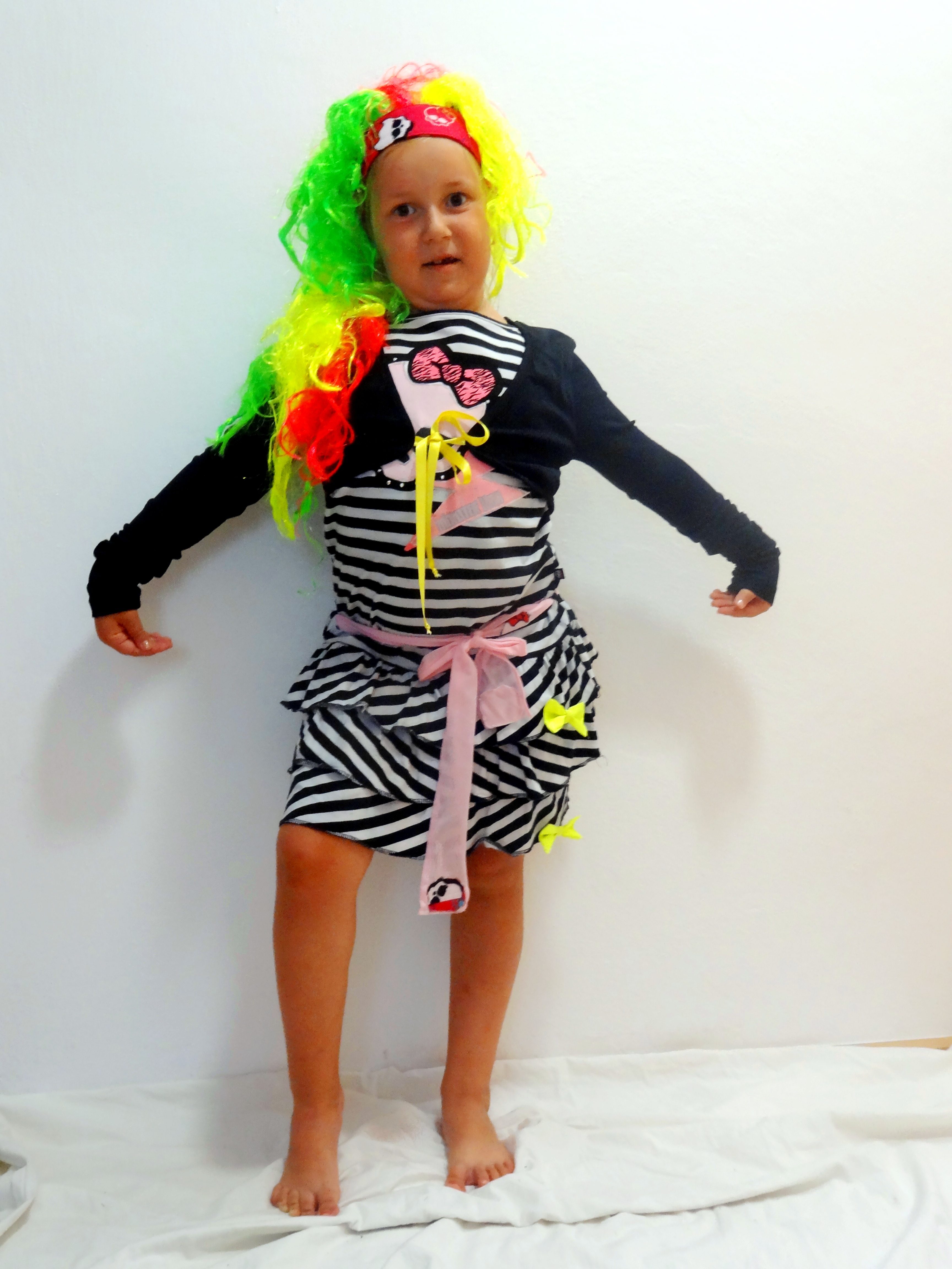 Kostým obsahuje dvojvrstvové šaty s volánovou sukňou, ozdobenou ružovým opaskom a trojfarebnú parochňu na čelenke