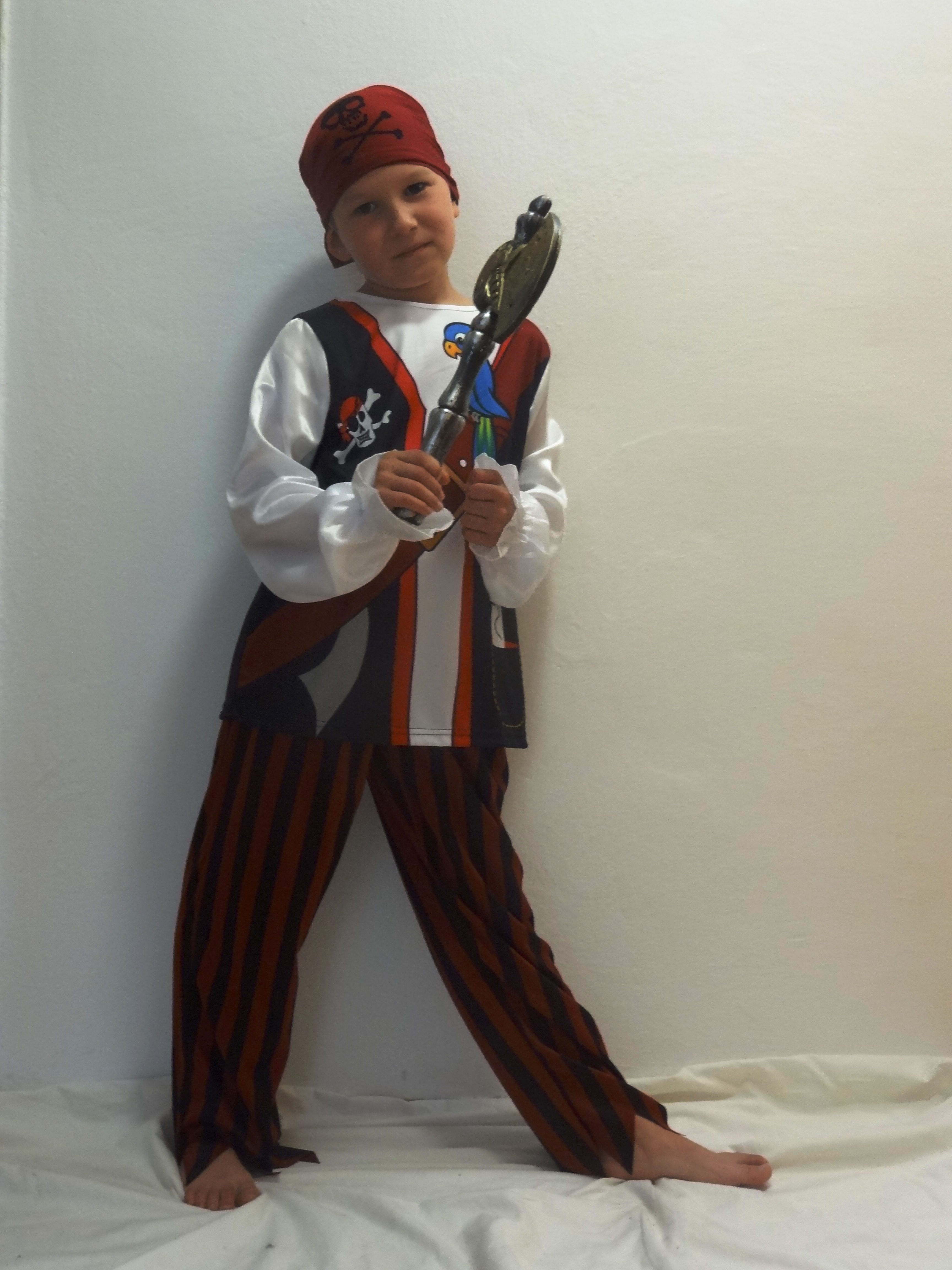 Kostým obsahuje bielo-čiernu košeľu s potlačou, šatku s potlačou lebky a nohavice