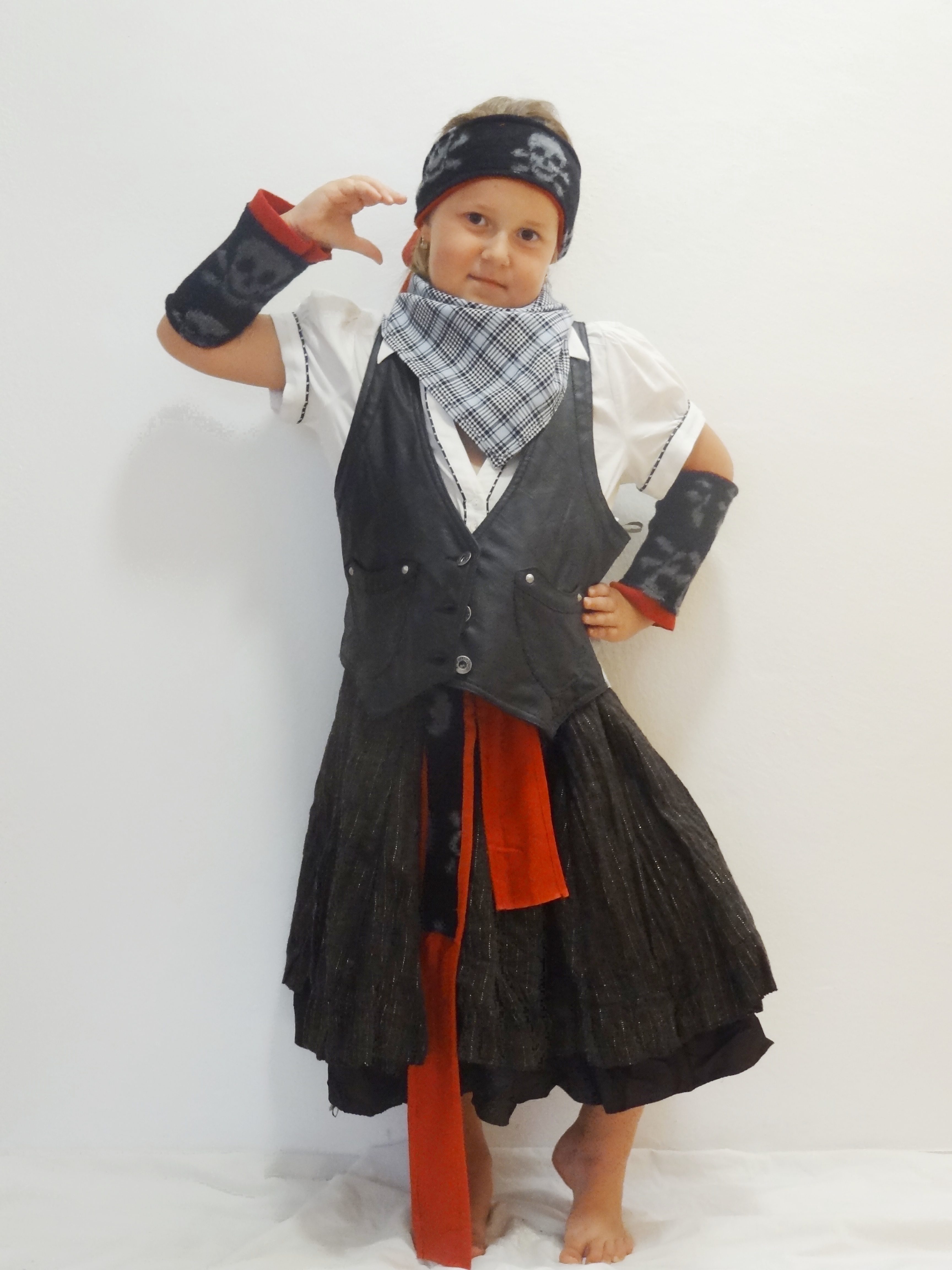 Kostým obsahuje bielu blúzku, hnedú koženú vestu, sukňu s lesklým efektom, opasok, čelenku s potlačou lebiek a návleky na ruky a šatku