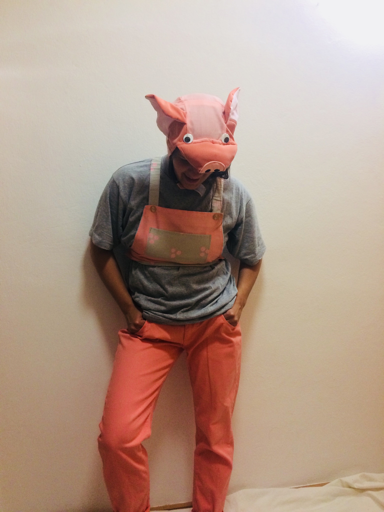 Kostým obsahuje ružové nohavice, samostatná vrchná časť s vreckom a trakmi a čiapku prasiatko