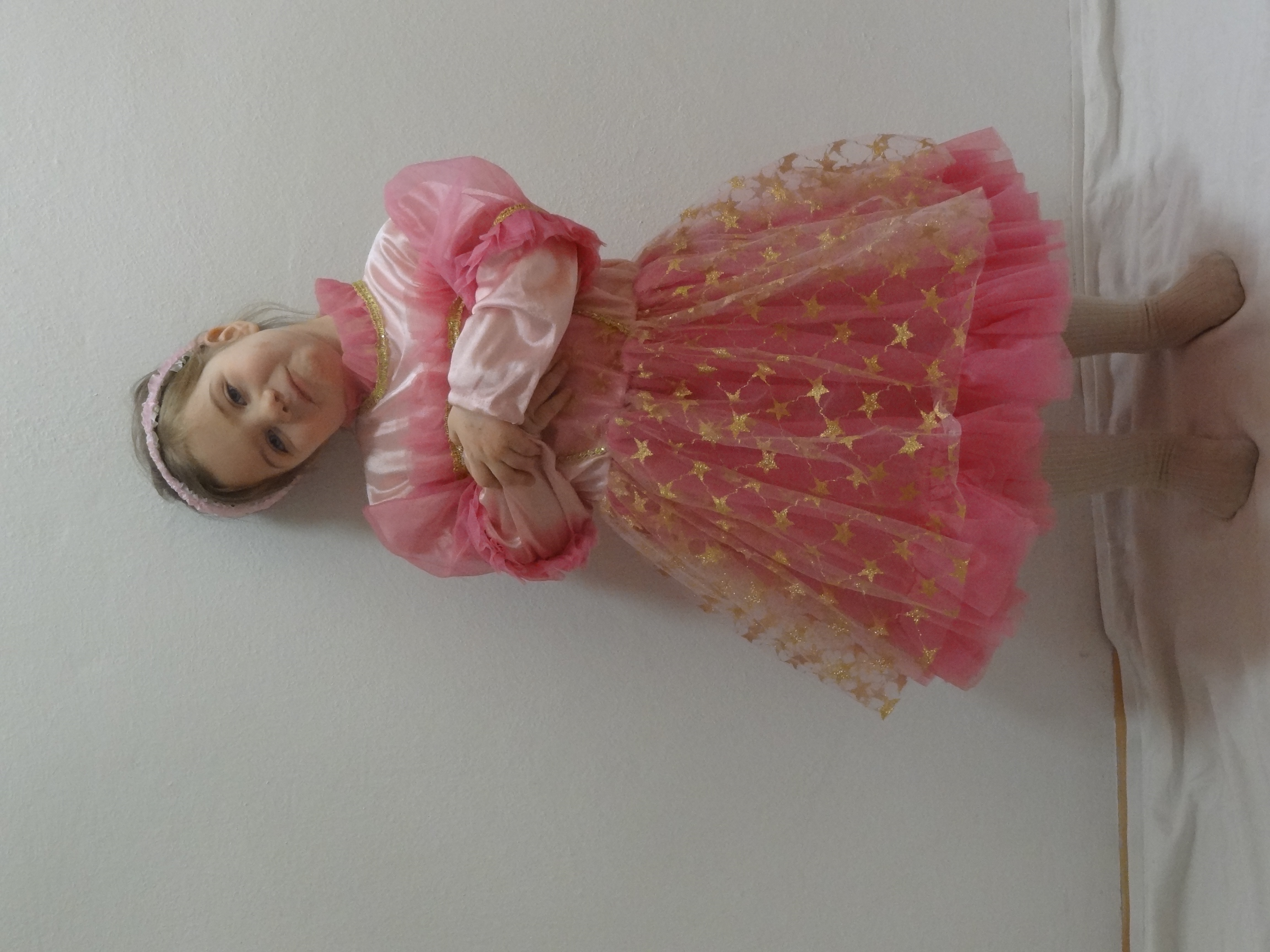 Kostým obsahuje trojvrstvové šaty s efektom zlatých hviezdičiek a ružovú čelenku s volánikom