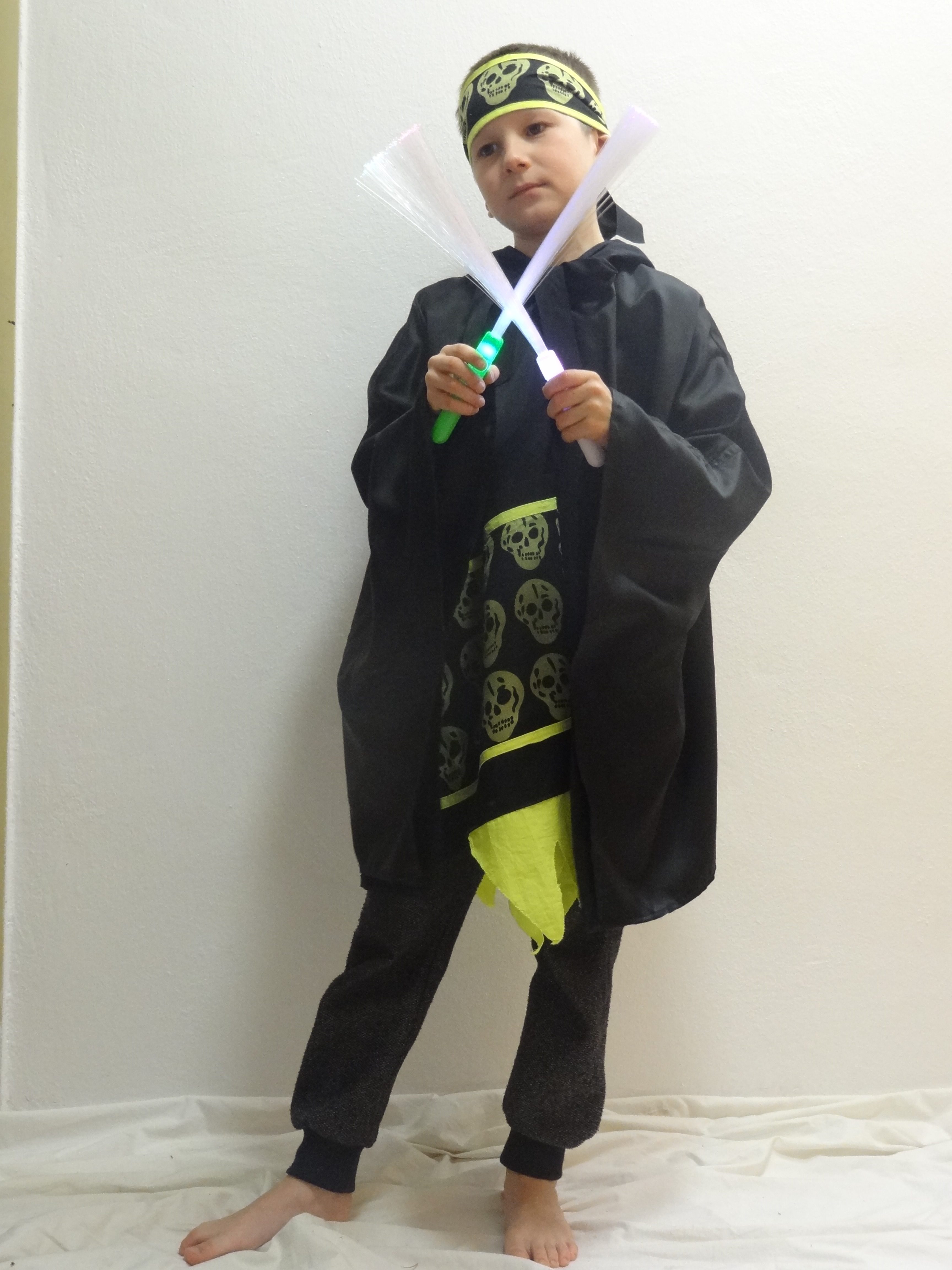 Kostým obsahuje plášť s kapucňou a aplikáciou zelených lebiek, čelenku so žltým lemovaním