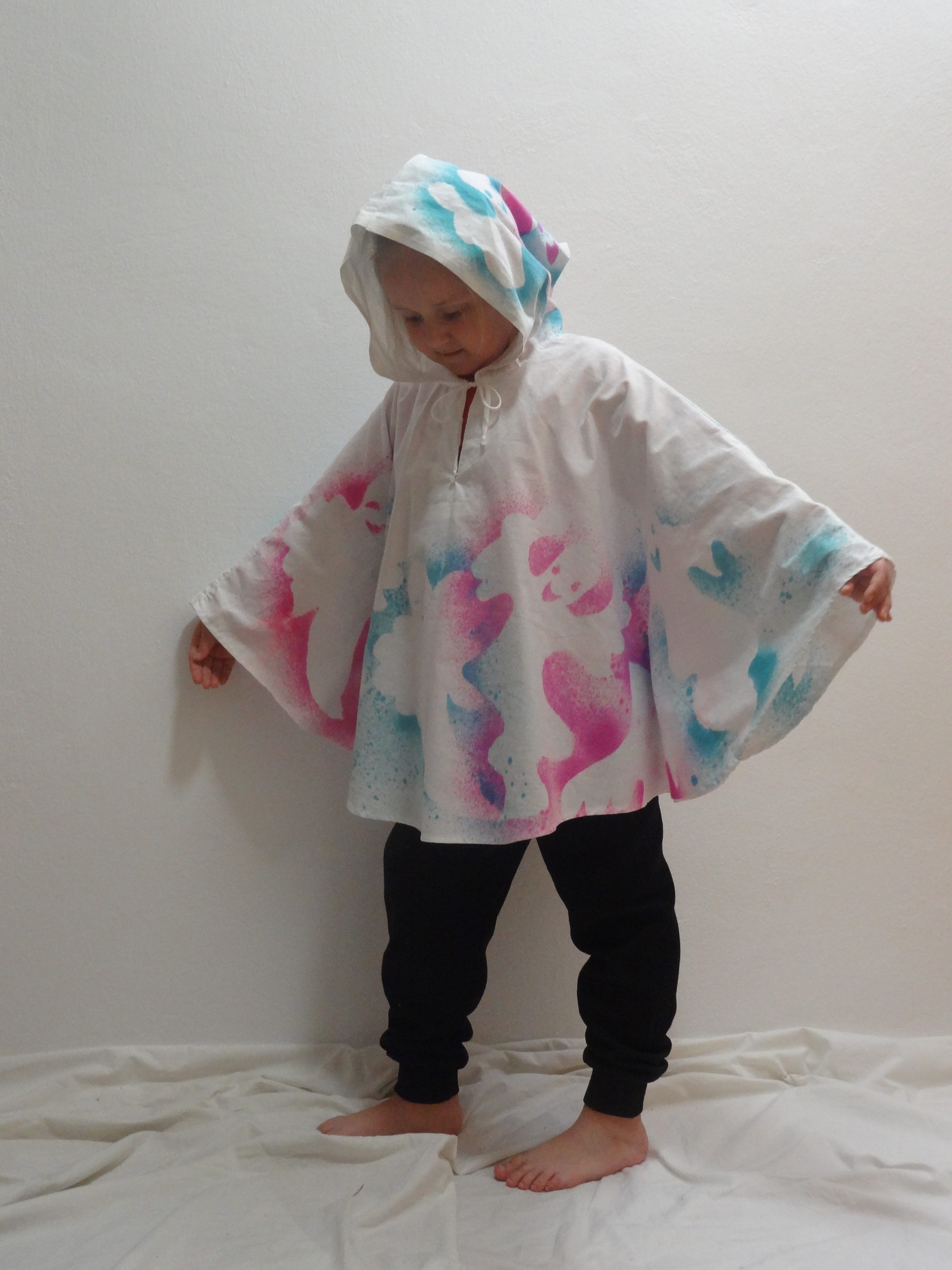 Kostým obsahuje plášť s kapucňou, potlačený strašidlami v zeleno-ružovej farbe