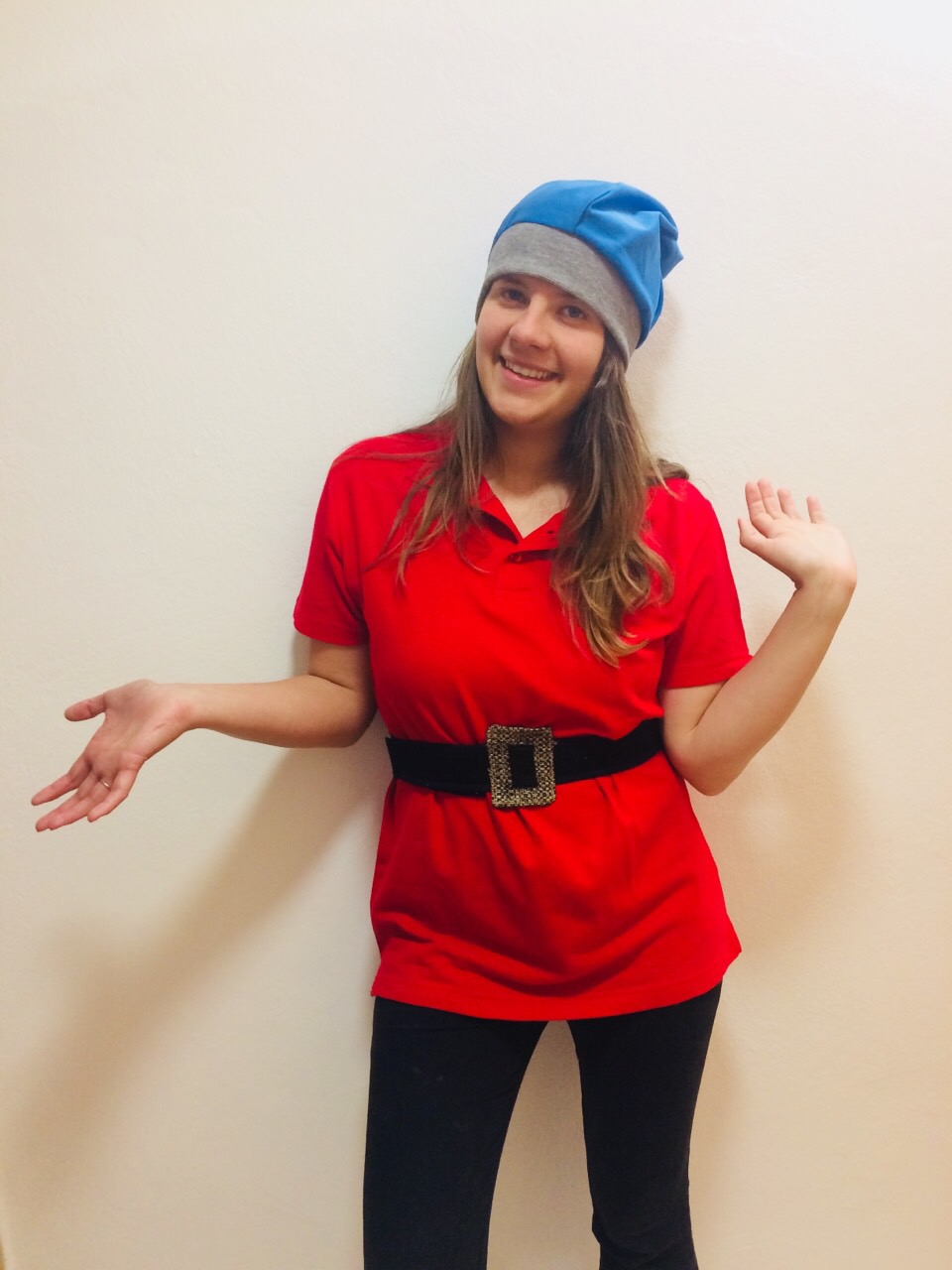 Kostým obsahuje červené polotričko, opasok, čiapku rôznej farby so šedým motívom