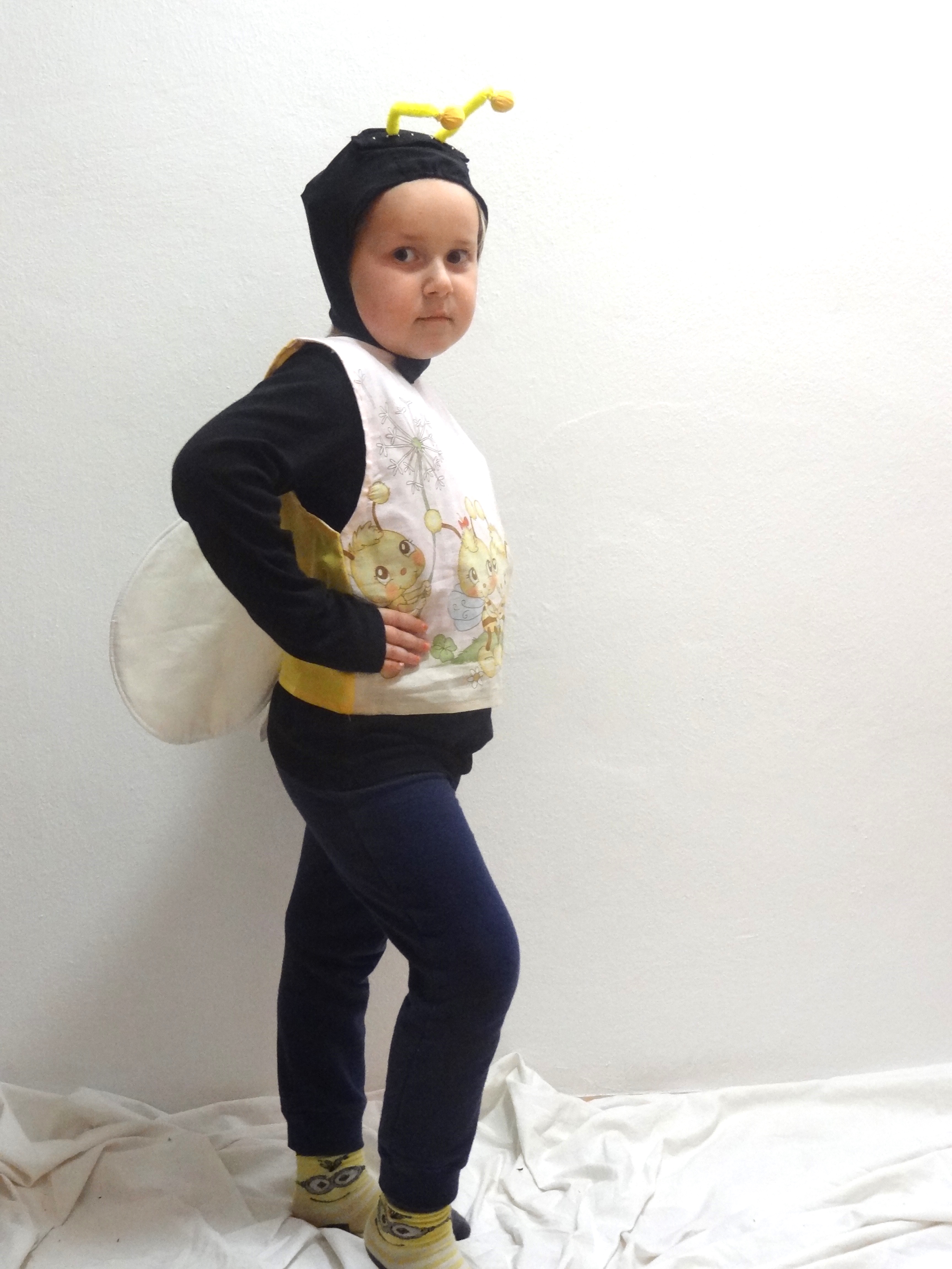 Kostým obsahuje žltú vestu s potlačou včielok a krídlami, čiapku s tykadlami