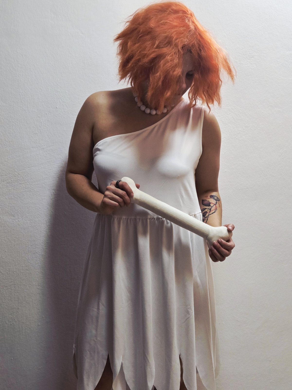 Kostým obsahuje biele šaty a náramok. Parochňa a kosť nie sú súčasťou kostýmu, dajú sa požičať za príplatok.