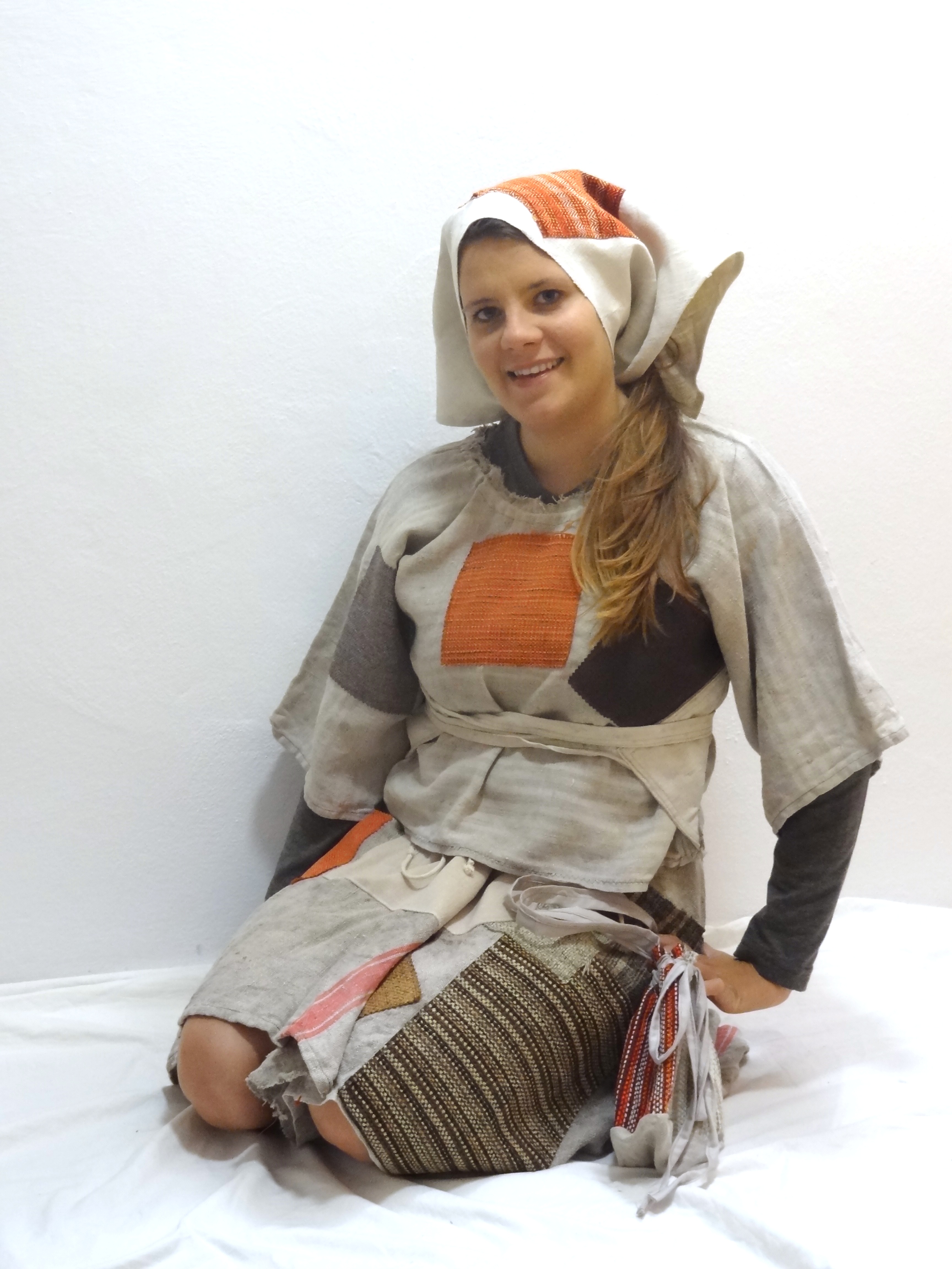 Kostým obsahuje ľanovú košeľu a sukňu so záplatami, šatku a taštičku
